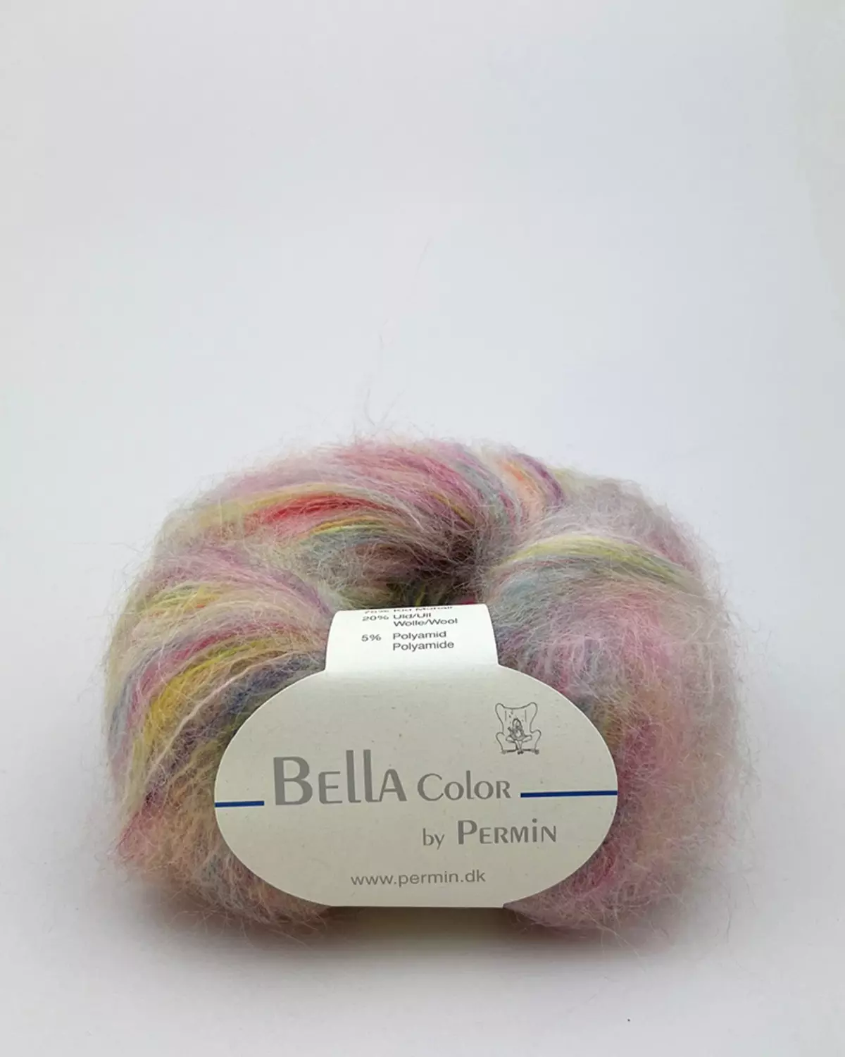 Bella Color by Permin inneholder 75% kid mohair, 20% ull og 5% polyamid og går ca. 145m på 50g.