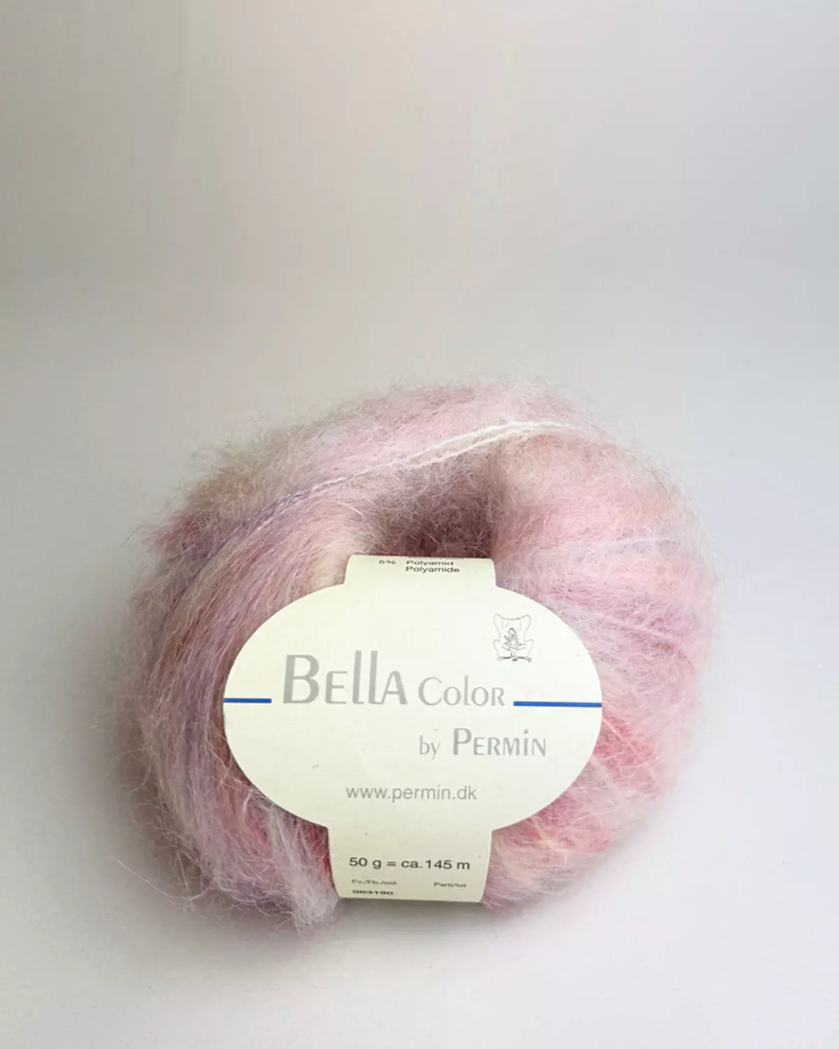 Bella Color by Permin inneholder 75% kid mohair, 20% ull og 5% polyamid og går ca. 145m på 50g.