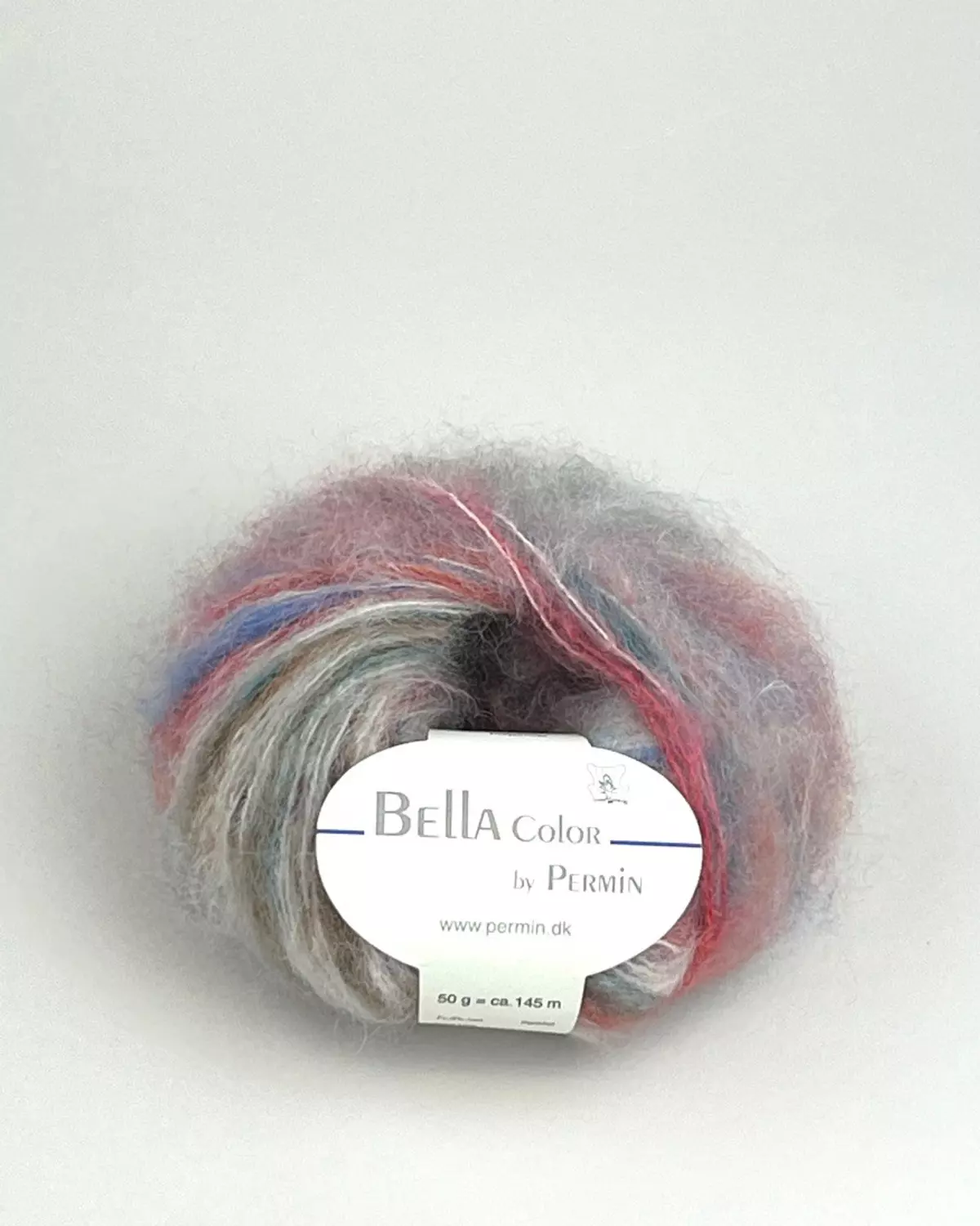 Bella Color by Permin inneholder 75% kid mohair, 20% ull og 5% polyamid og går ca. 145m på 50g.