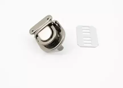 Veskelås i metall. Festes gjennom stoffet med en plate på baksiden. Toppen klemmes fast rundt kanten på veskelokket. Nikkelfri.